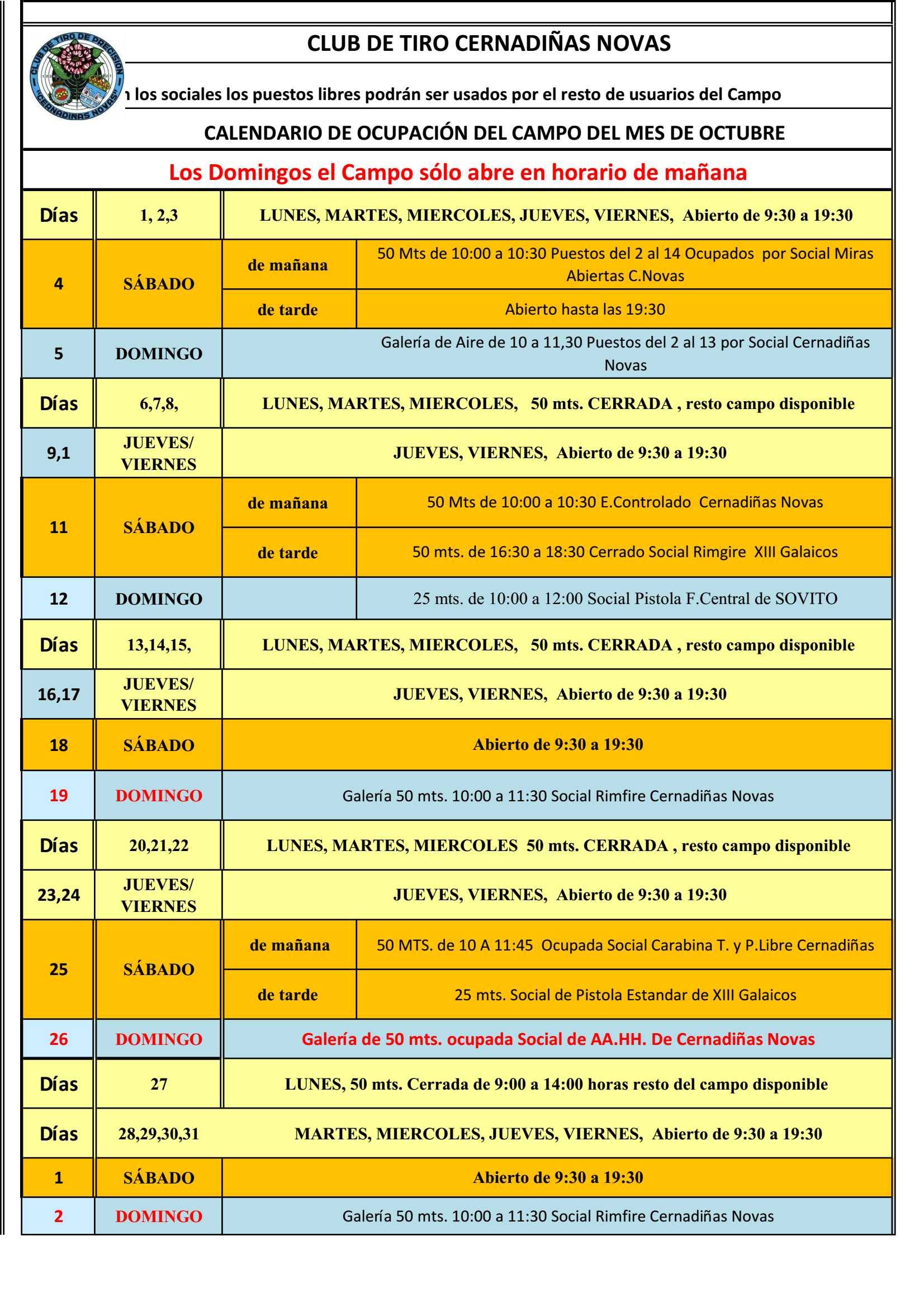 • 29/09/2025 Calendario de ocupación del mes de Octubre