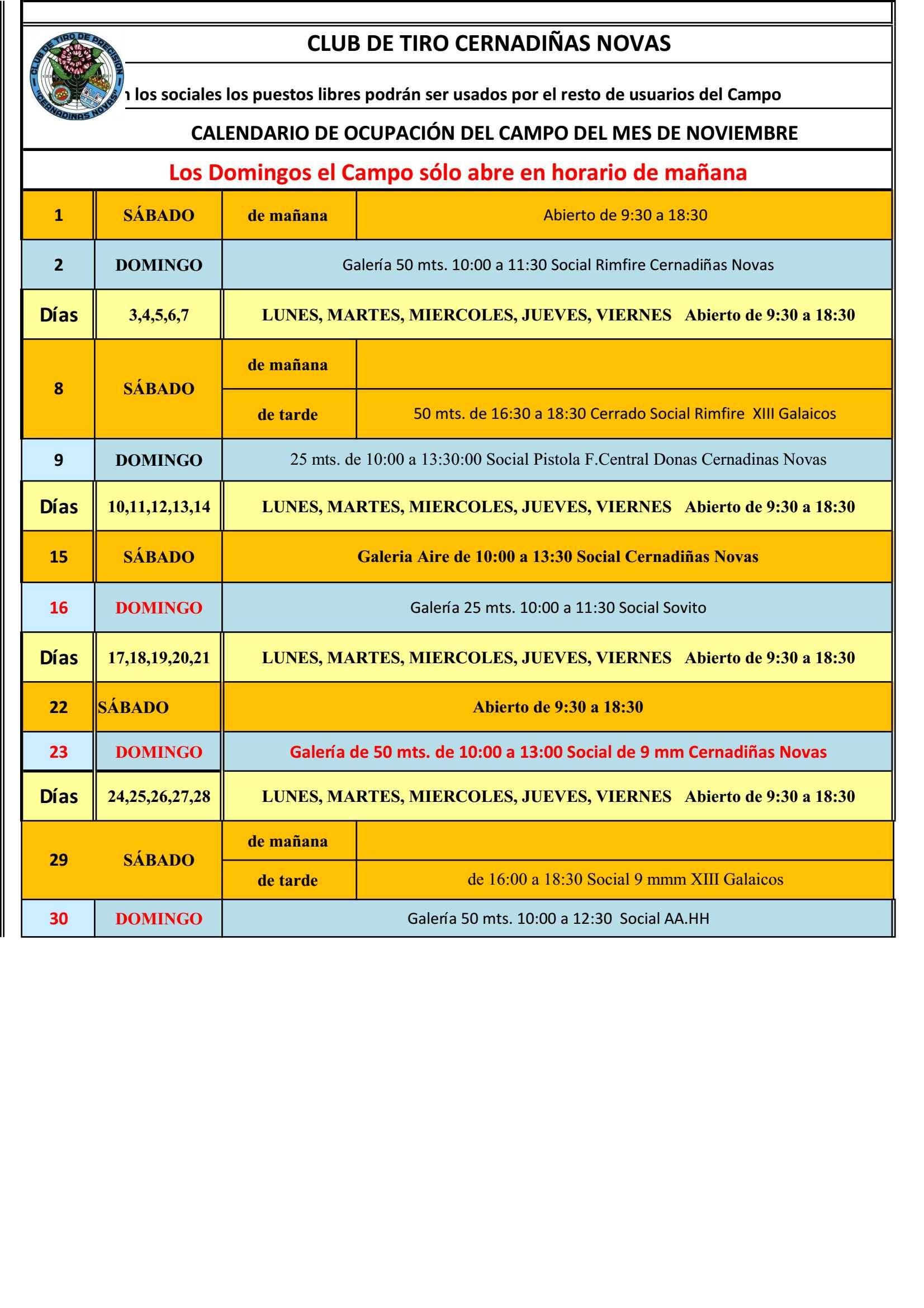 • 04/11/2025 Calendario de Ocupación del Campo de Noviembre